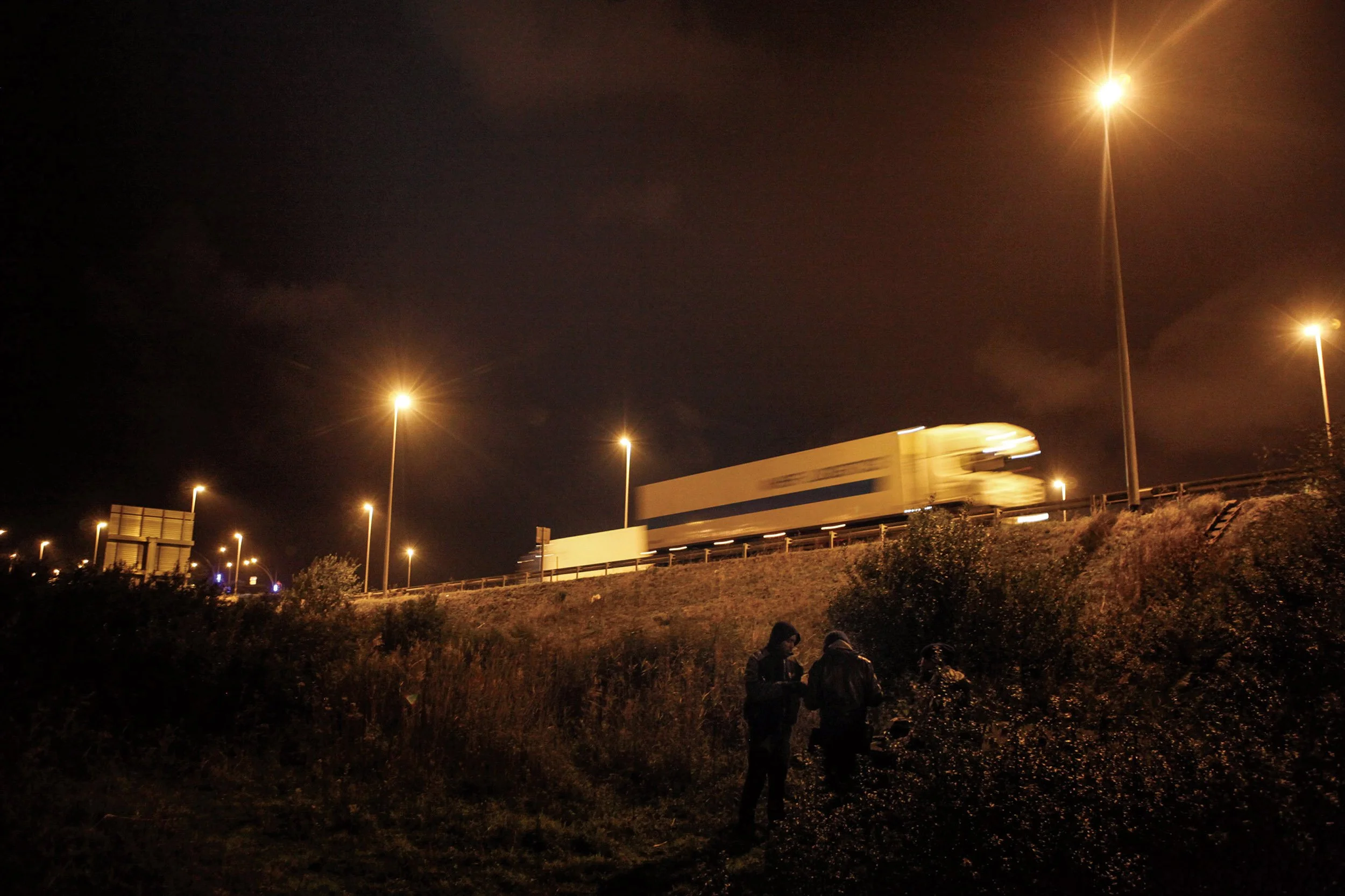 We wait on the road side but it is a bad night, the lorries are few and far between. Finally one with Spanish number plates pulls into the petrol station. The driver gets out to refuel and we race across urgently, the men crawling under the lorry, trying doors, bolts and latches, investigating every part of it for a place to hide. The driver calls out to them in Spanish, but is ignored. I can feel my own heart beating but these men seem to know no fear, perhaps because they try this night after night, perhaps because of all they have been through to get this far. Only the sight of a police car pulling up on the roadside sends us all scattering for cover. Suddenly men are falling over each other looking for places to hide and waving their arms at me to indicate the tasers, pepper spray and temporary blindness that they have told me they experience quite regularly. We crouch in the bushes for ten, maybe twenty minutes, it feels like forever. I start hiding my memory cards in my socks, just in case....