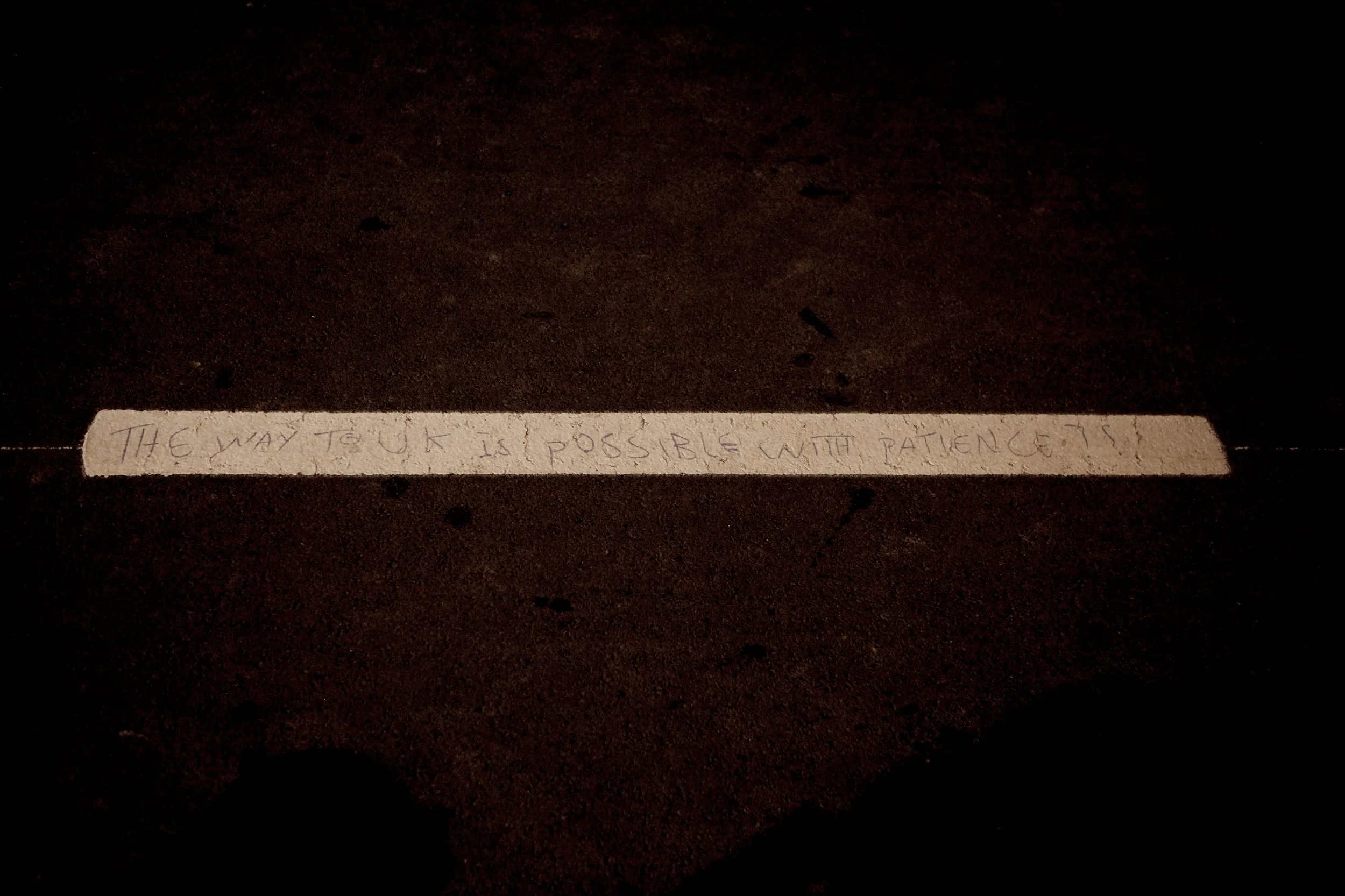 Words scrawled on road markings at the port of Calais