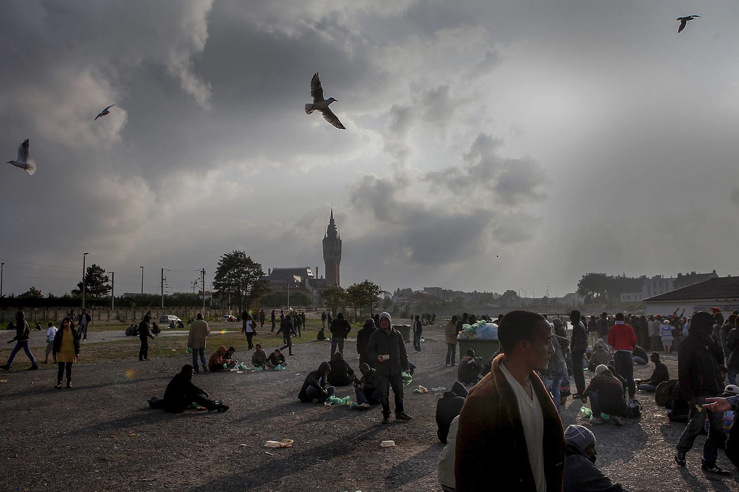 Asylum seekers eat food handed out by the charity Salam, by the canal in Calais.